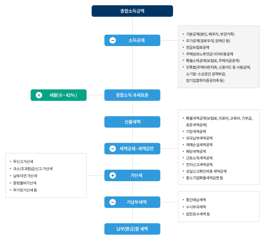 여기서 기본적으로 알아볼 것인 공제입니다. 법인이 아닌 개인의 경우 보통의 연말정산 소득공제, 세액 공제를 살펴보면 되는데요. 한눈에 볼 수 있는 세액계산 흐름도를 첨부합니다.