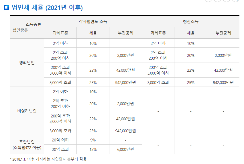 보통 일반적인 경우에 영리법인을 보면 됩니다. 법인 소득 2억원 이하의 경우 10%의 세율입니다. 200억이하는 20%이고요 3,000억원이 넘어야지만 25%의 세율을 걷습니다.