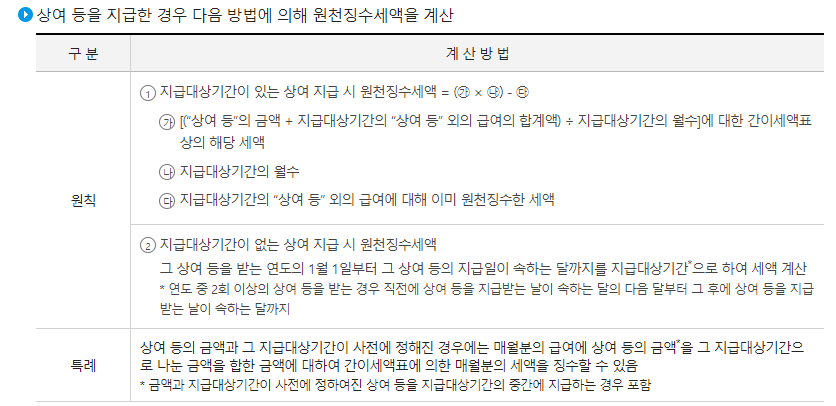 다음은 국세청에서 근로소득 세액을 계산할 때 알아야할 유의사항 자료가 있어서 가져온 것입니다. 모두 상여에 대한 얘기입니다. 만약 상여를 받지 않으신다면 아래글은 보실 필요가 없습니다.