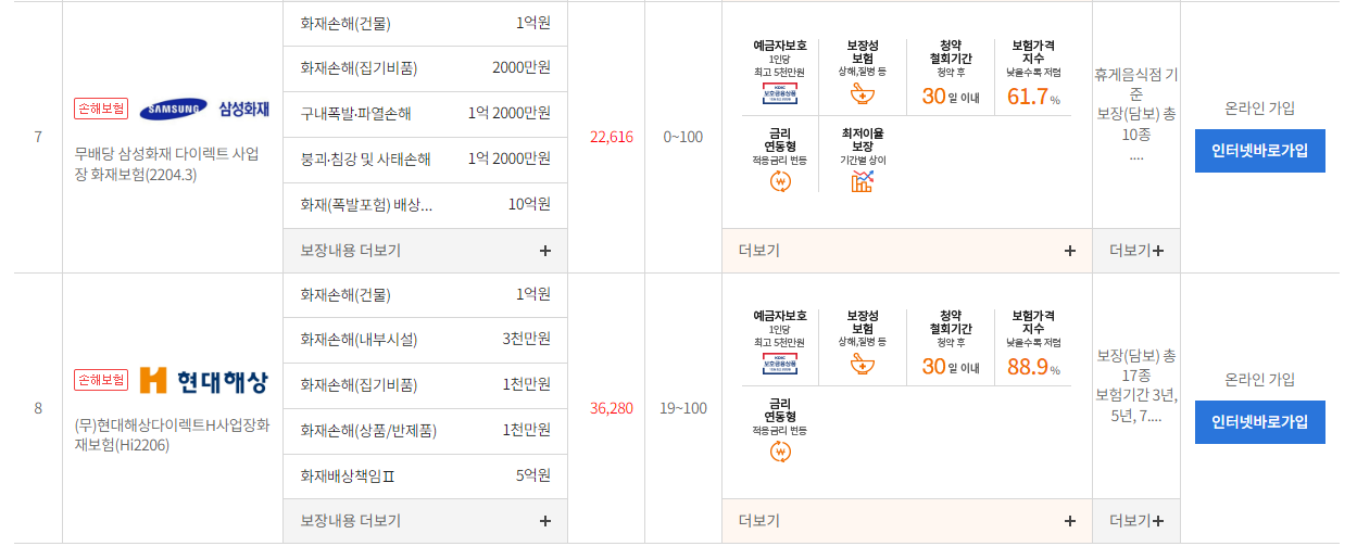 보장성보험 - 화재/재물보험으로 들어가면 화재보험들을 볼 수 있는데요. 아쉽게도 대부분은 아파트 화재보험이었습니다. 상가, 즉 사업장 화재보험은 단 2가지 였습니다.