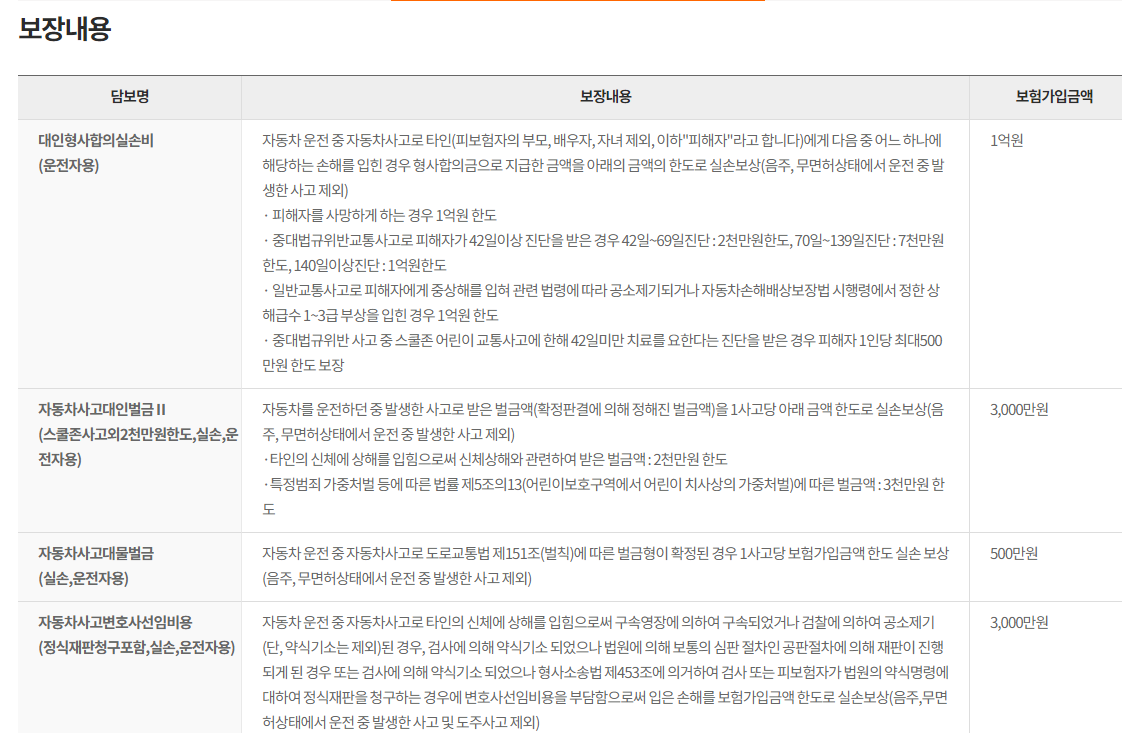 자세한 내역은 아래와 같습니다. 이중에 합의금 가입금액이 넉넉한지 특히 잘 살펴봐야합니다. 큰 금액이 나갈 수도 있는 항목이거든요.