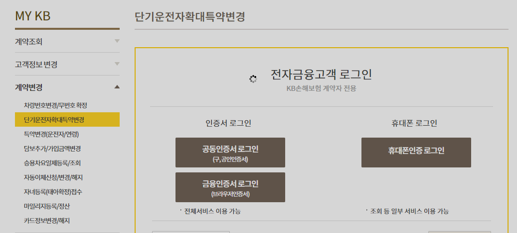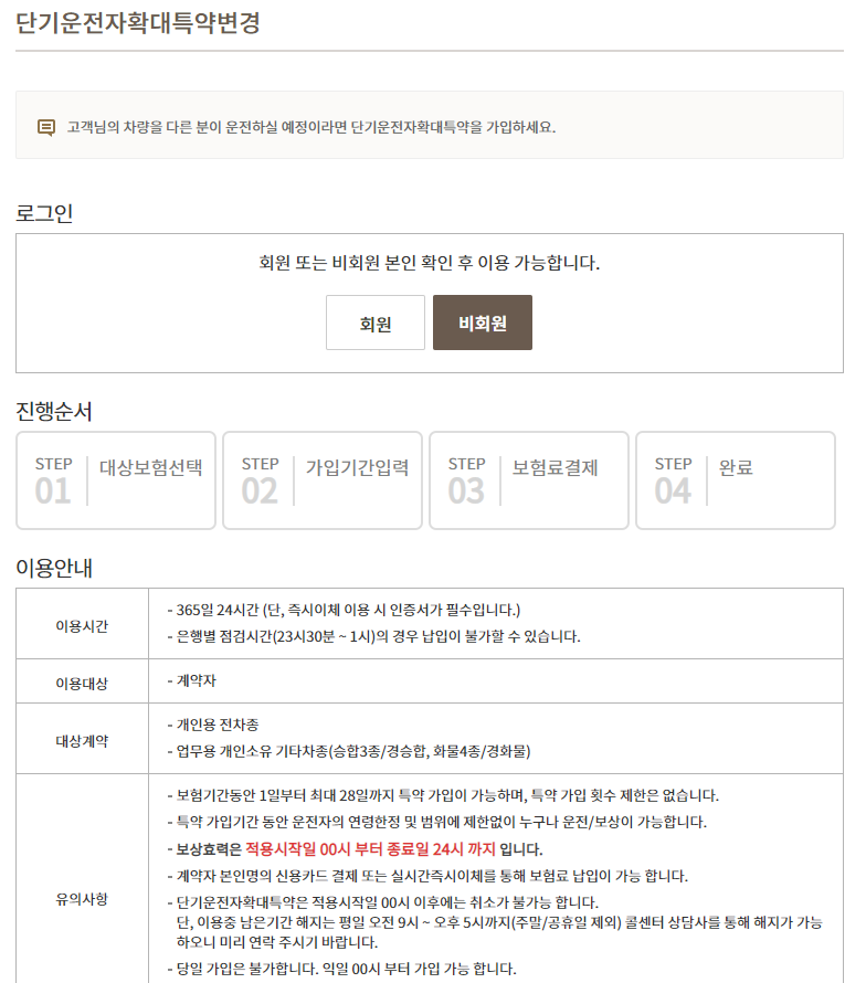 KB손해보험은 하루짜리 보험은 없습니다. 대신에 단기운전자확대특약변경이 가능합니다. 이를 통해 차주가 아닌 다른 사람이 운전을 하더라도 보험 혜택을 받을 수 있습니다. 차주에게 말을 하고 신청을 해야한다는 단점이 있습니다. 그리고 보험가입 당일 운전은 불가능합니다. 미리 계획을 세워야 정상적으로 가입을 할 수 있습니다.