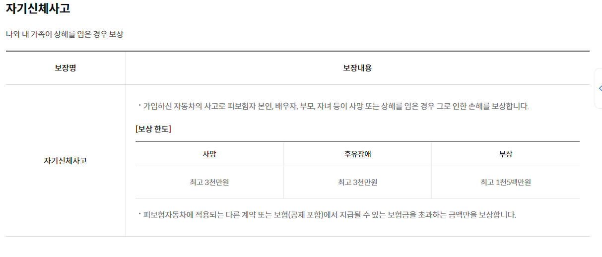 다음은 내차에 타고 있는 나와 내 가족이 상해를 입은 경우의 보상입니다. 보상한도는 최고 3천만원이고. 포함되는 사람은 본인, 배우자, 부모, 자녀 등이 있습니다. 부상의 경우 보상 한도는 최고 1,500만원 입니다.