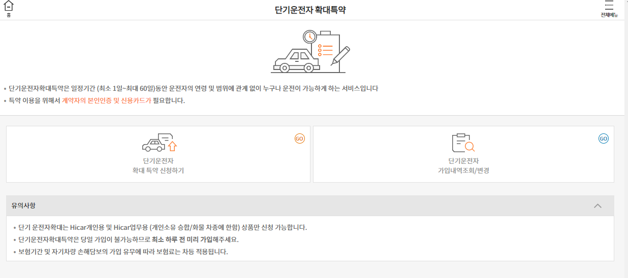 현대해상도 KB와 비슷하게 단기운전자 확대 특약이 있습니다. 마찬가지로 반드시 1일 이전에 가입을 해야하고요. 운전자 연령과 범위에 관계없이 누구나 운전이 가능합니다.