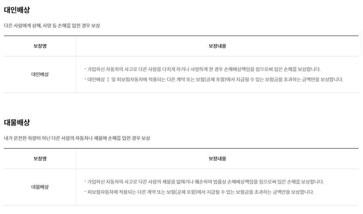 기본적인 대인, 대물배상이 있습니다. 대인의 경우 다른 사람을 상해 사망 등으로 손해를 입힌경우 보상입니다. 대물배상의 경우 내 차가 아닌 다른사람의 자동차나 재물에 손해를 입힌 경우의 보상입니다. 가장 기초가 되는 보상 내용입니다. 특약을 통해 배상 한도를 높일 수 있는 경우도 있습니다.