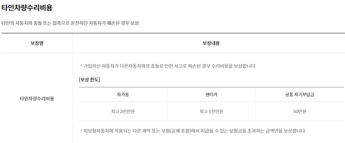 타인차량수리비용 보상입니다. 보상한도는 최고 3,000만원입니다. 자동차보험의 경우 이 보상의 한도를 높게 해놓는 경우도 많습니다. 요새는 수리비가 비싼 외제차들이 워낙 많기 때문이죠. 공통자기부담금은 50만원입니다. 50만원은 본인이 부담하고 나머지 금액을 보험에서 보상받을 수 있습니다.